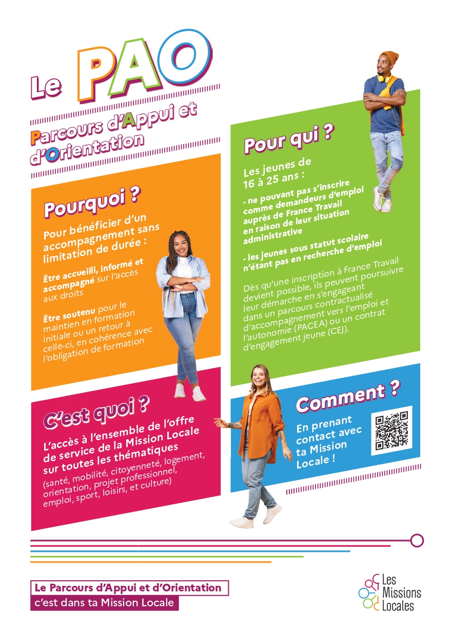 Le Parcours d’Appui et d’Orientation (PAO) est un dispositif proposé par la Mission Locale, destiné aux jeunes de 16 à 25 ans rencontrant des difficultés d’insertion sociale ou professionnelle. Il permet de bénéficier d’un accompagnement personnalisé pour construire progressivement un projet d’avenir.